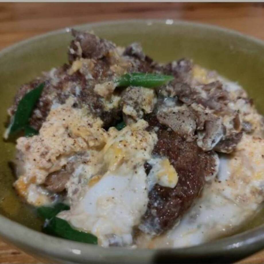牛すじは柔らかく煮込んで余分な脂は取り除いています。そこに揚げたてのカキフライイカメンチを入れて玉子でとじちゃう。