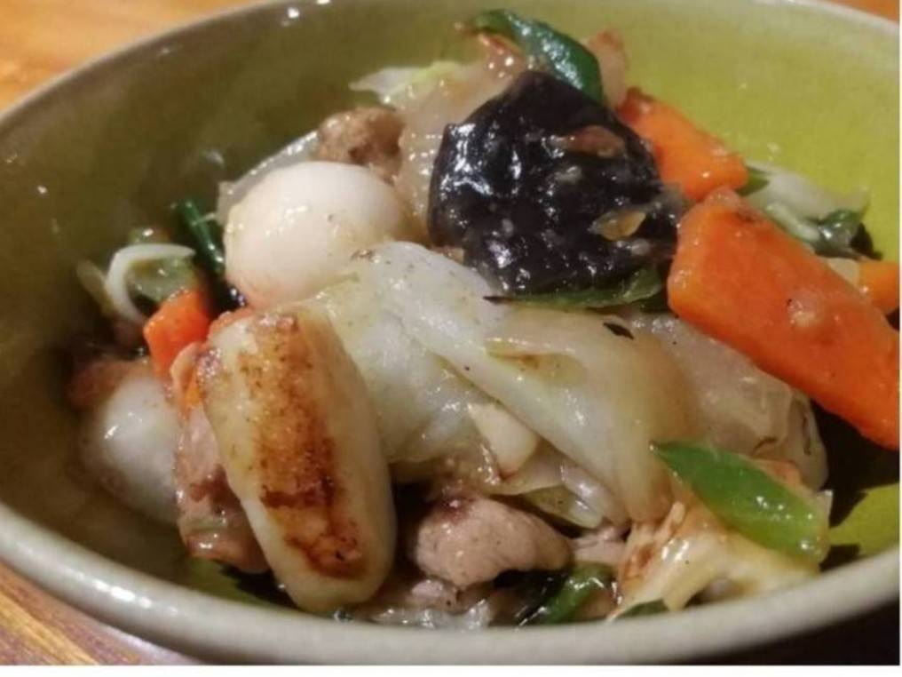 It's packed with ingredients like Chinese cabbage, wood ear mushrooms, bamboo shoots, carrots, vinegar-marinated mushrooms, and quail eggs. Serve it over rice for a bowl!
