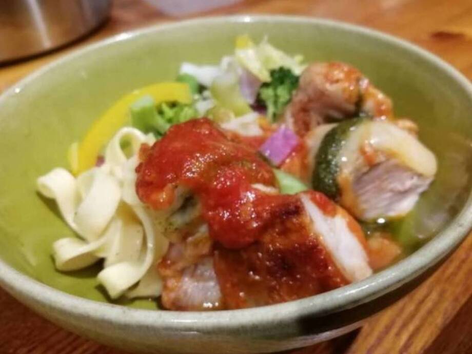 そうです!2%の塩水に浸けた鶏もも肉皮目パリパリに焼いたお肉をピザ生地に見立て、旨味たっぷりトマトソースと、バジル、チーズをたっぷりか